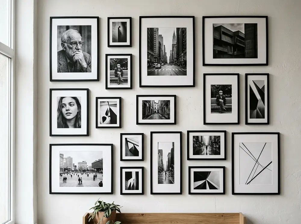 Absolument. L’important est de conserver une cohérence chromatique stricte — tout en noir et blanc — et de varier les formats pour créer un rythme visuel intéressant. Le mélange des styles enrichit la composition sans la brouiller.
