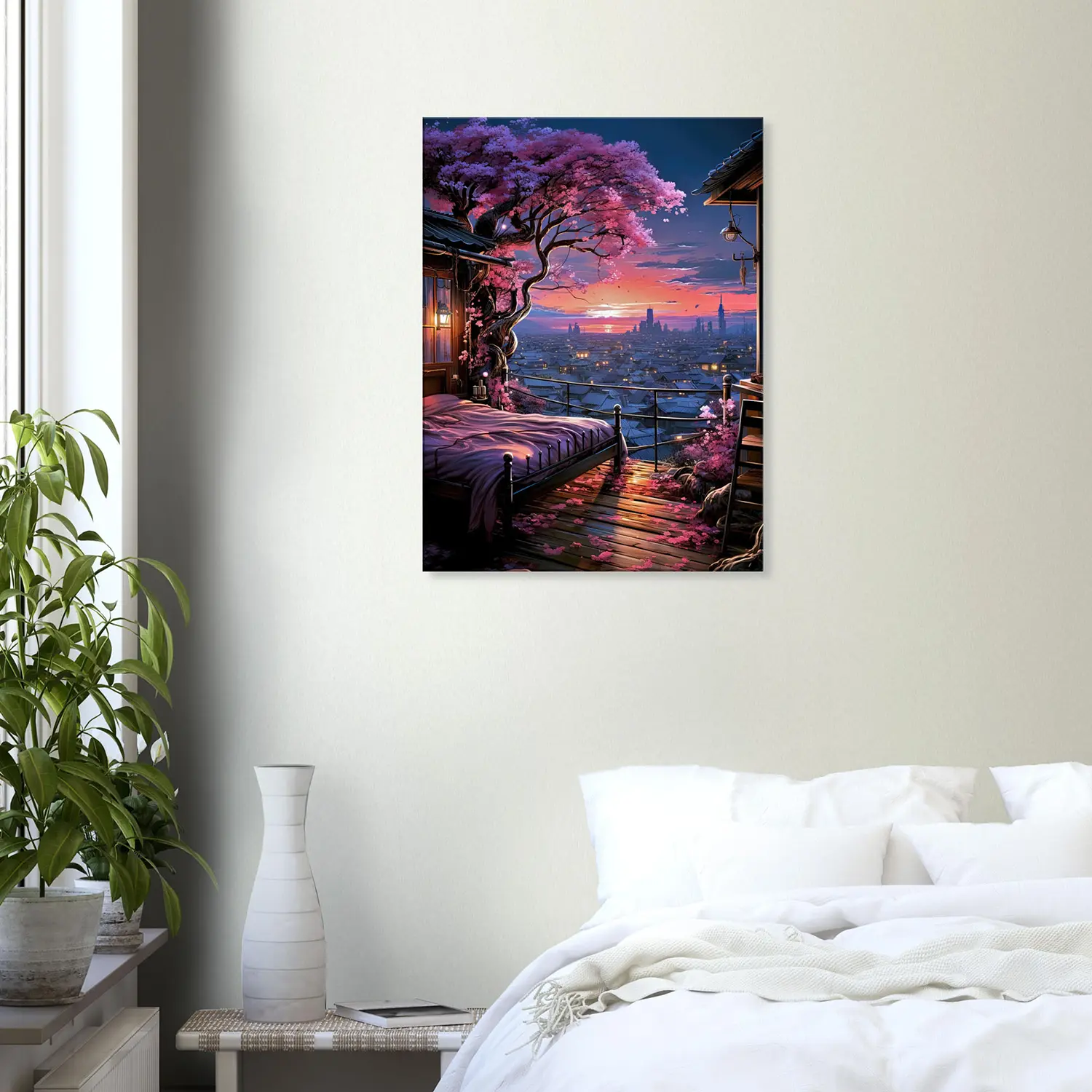 « Aube Florale : Vue d’un Havre Urbain » est une création numérique qui encapsule la sérénité d’un réveil printanier dans un contexte urbain. L’image présente une chambre extérieure où le lit est entouré par la grâce d’un cerisier en fleurs, ses pétales dansant doucement au rythme d’une brise légère. L’arrière-plan révèle une ville qui s’éveille sous un ciel aux teintes de pourpre et d’or, annonçant un nouveau jour. La lumière de l’aube filtre à travers les branches, caressant délicatement l’espace et invitant à la contemplation. Ce tableau est un hommage à la beauté qui se trouve à la convergence de la nature et de l’architecture, un rappel que même au sein de l’agitation de la ville, il existe des oasis de calme et de beauté.