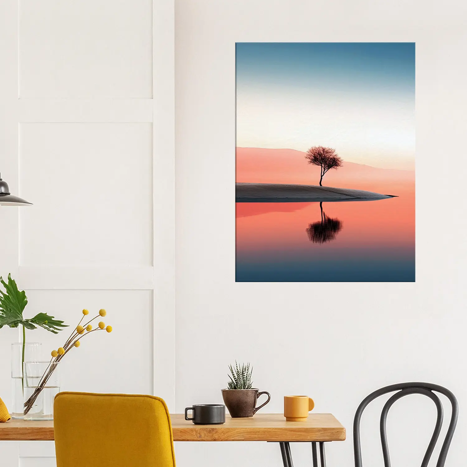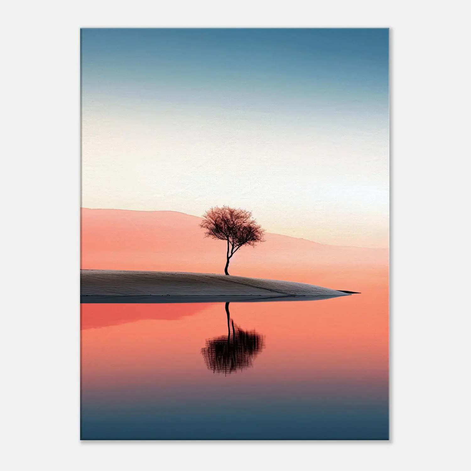 L’Essence de la Sérénité Dans cette œuvre, l’arbre solitaire se tient debout, non pas comme un signe de solitude, mais comme un symbole de résilience et d’autonomie. La réflexion de l’arbre sur l’eau calme est une méditation visuelle sur l’importance de l’introspection et de l’équilibre. Les tons roses et bleus du ciel et de l’eau s’unissent pour créer une atmosphère de sérénité et de paix intérieure.