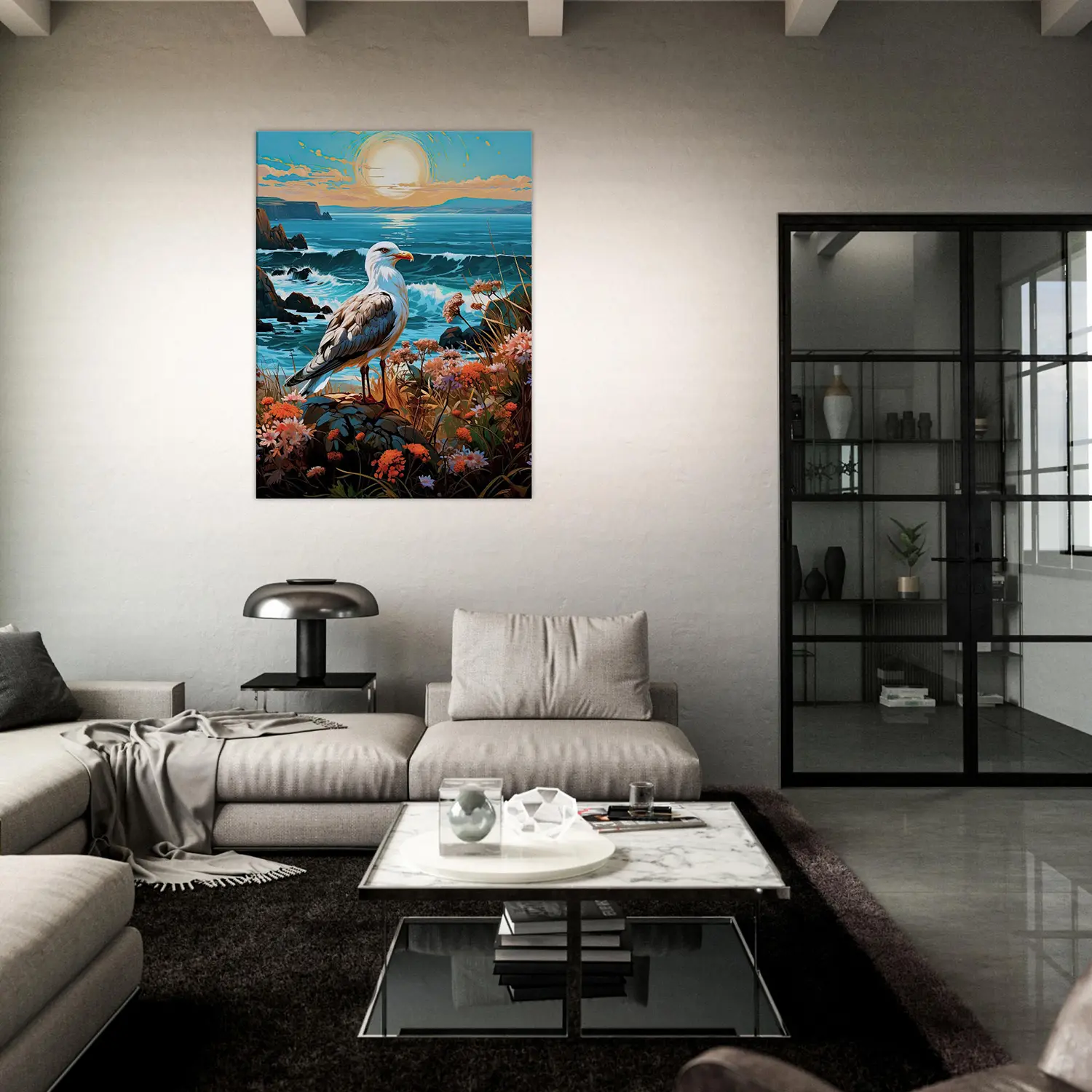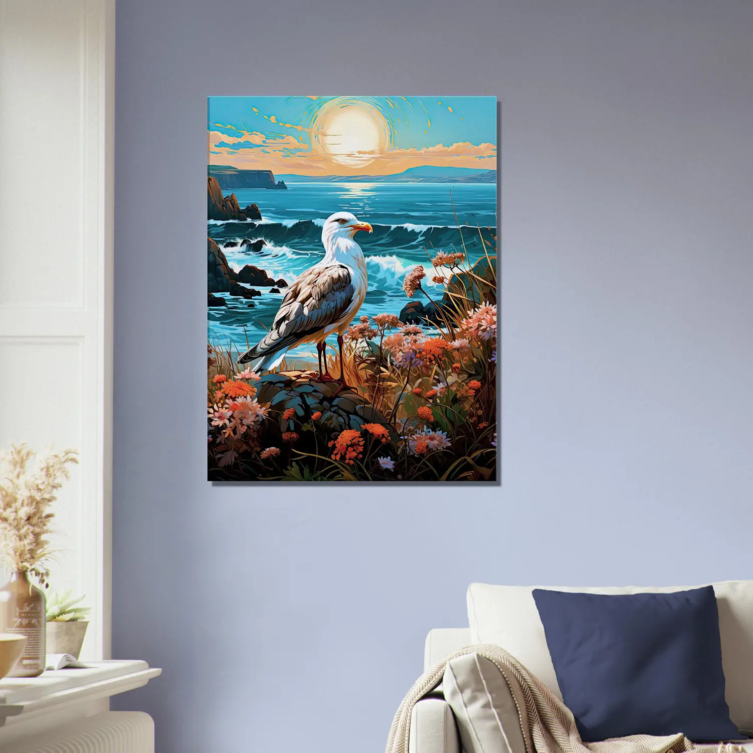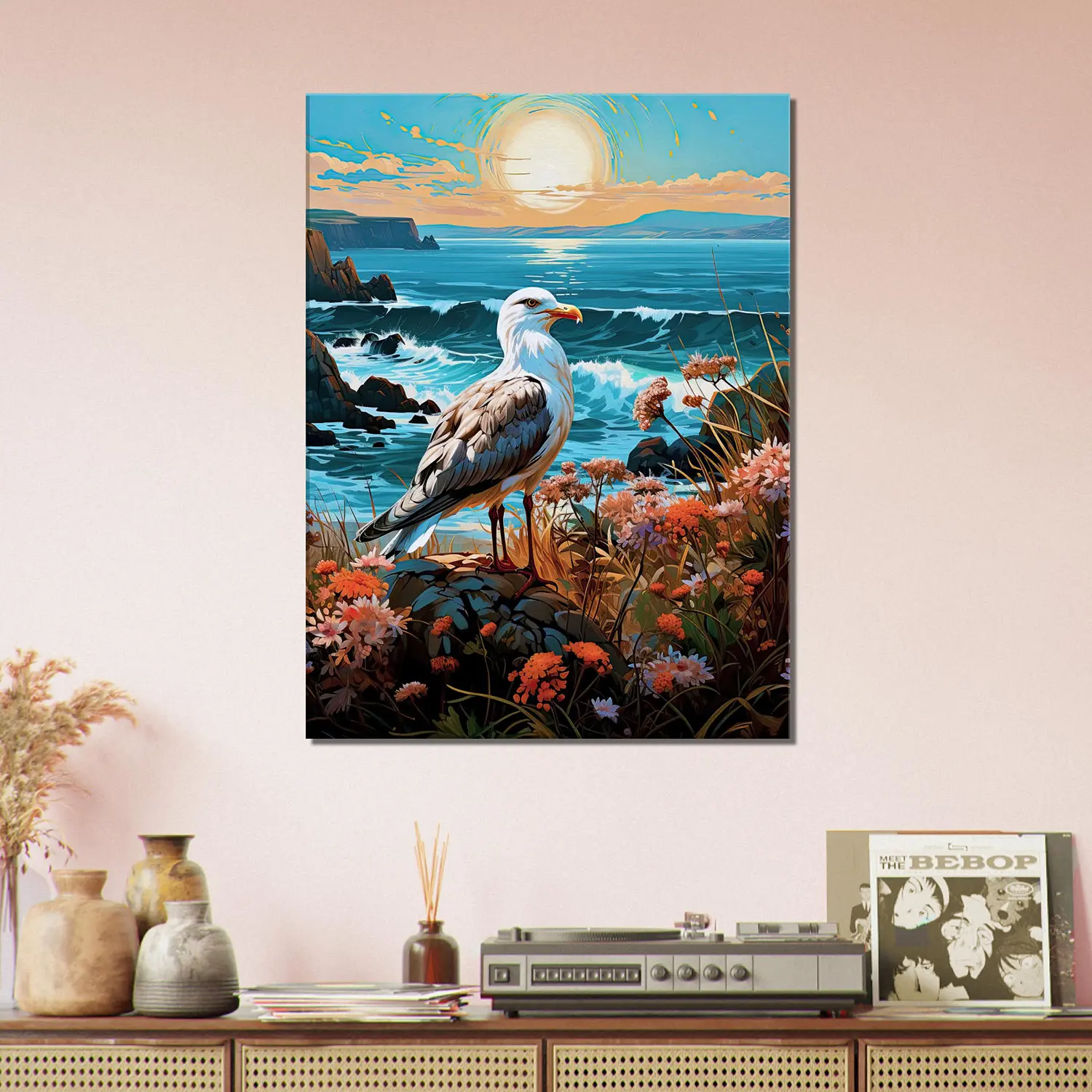L’œuvre présente une majestueuse mouette se tenant fièrement sur des rochers en bord de mer. Le soleil couchant projette une lumière dorée sur l’horizon, donnant à la mer une teinte bleutée magnifique. La mouette, avec son plumage détaillé, est le point focal de cette pièce, tandis que les fleurs sauvages ajoutent une touche de couleur et de vivacité à l’avant-plan. Les vagues se brisant contre les rochers ajoutent une dynamique à la scène, créant une harmonie entre calme et mouvement.