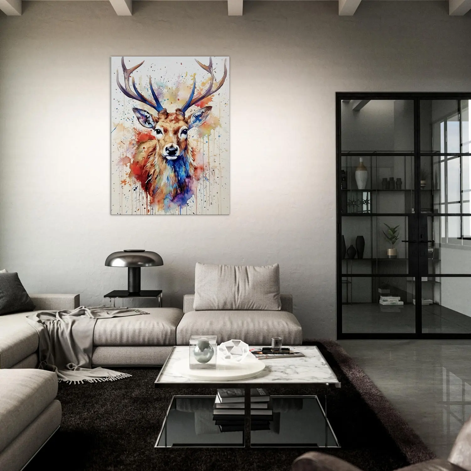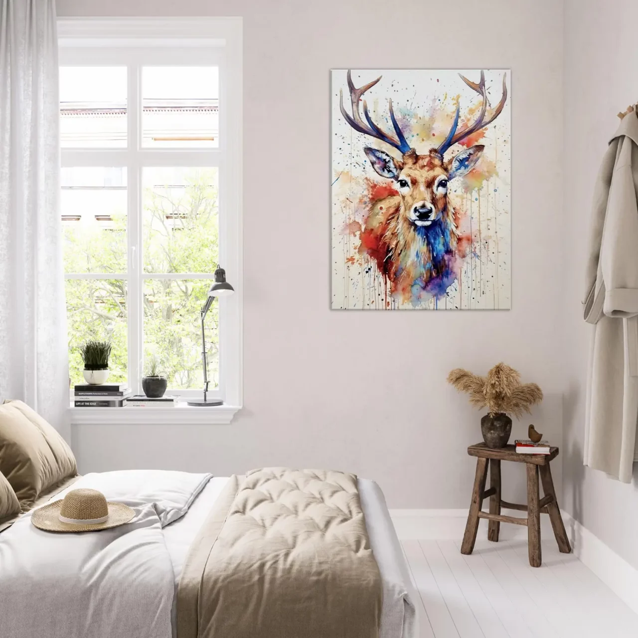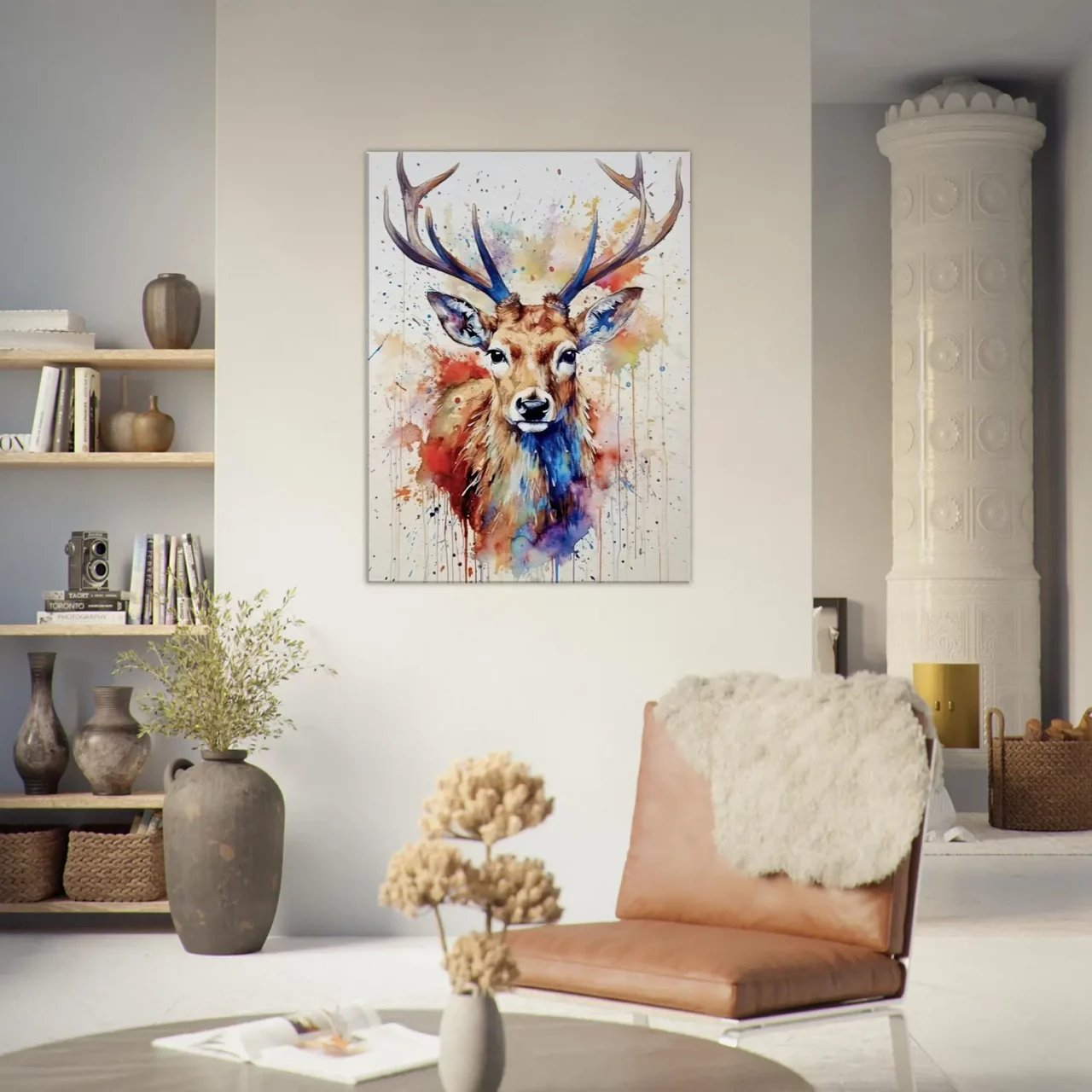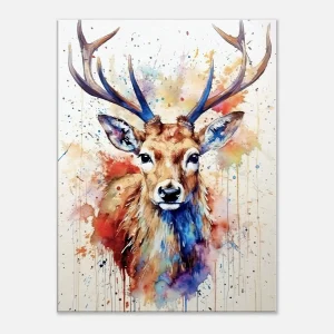 Le tableau se distingue par l’utilisation d’une palette de couleurs apaisantes et envoûtantes. Les taches de peinture orangées et bleues qui entourent le chevreuil évoquent un environnement forestier, créant une harmonie visuelle fascinante sur un fond blanc immaculé. Ces touches de couleur ajoutent un sentiment d’aisance et de sérénité, tout en accentuant l’impact visuel de l’animal.