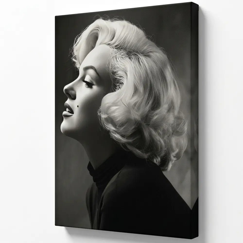 Ce portrait noir et blanc capture l’essence du glamour hollywoodien des années 1950. Le profil légèrement levé vers la lumière, les boucles platines soigneusement sculptées, le col roulé sombre qui contraste avec la luminosité du visage — chaque élément de la composition respire l’élégance et la maîtrise.