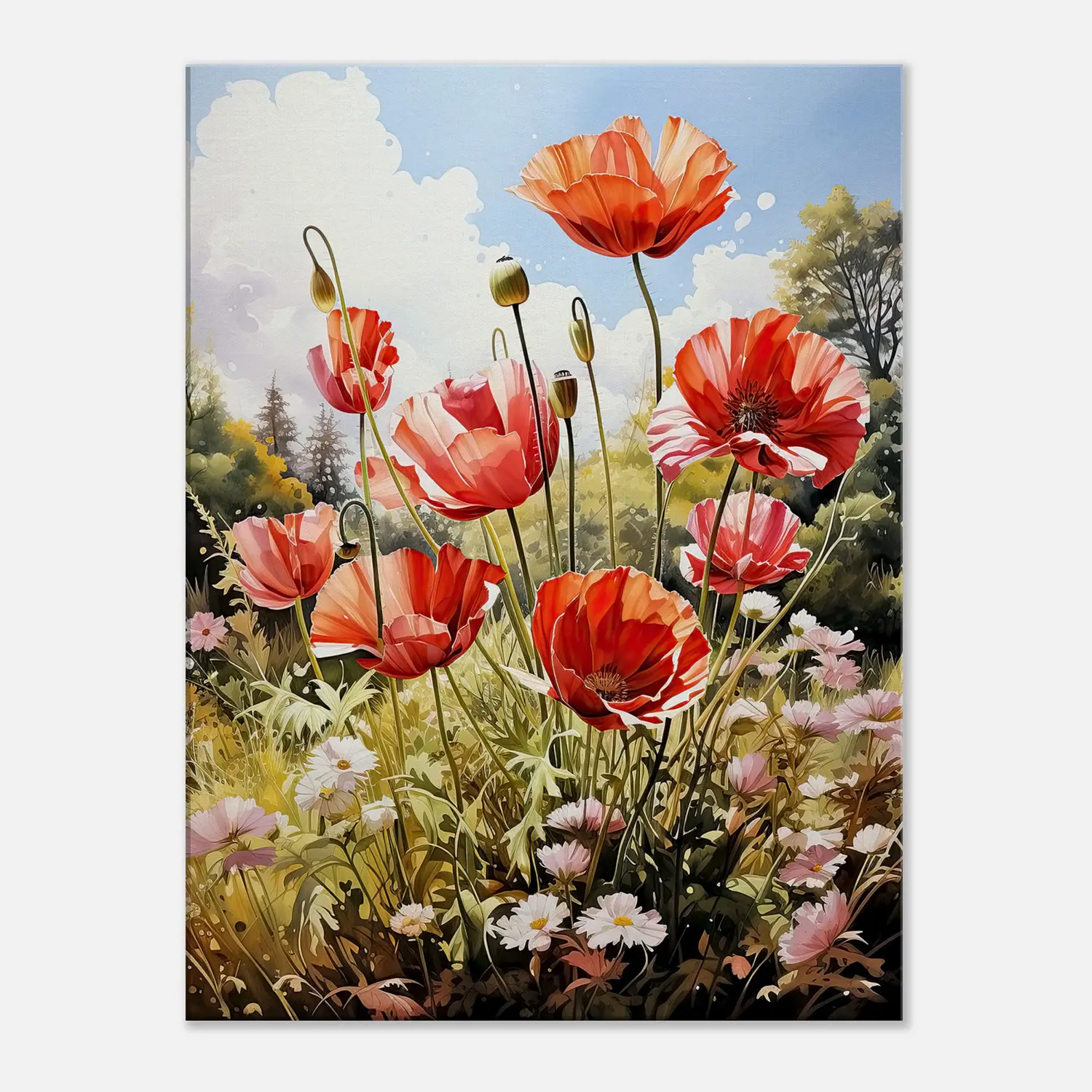 Cette œuvre est une illustration dédiée à la beauté naturelle des fleurs sauvages. Au premier plan, vous pouvez admirer quelques tulipes rouges éclatantes et des pâquerettes sauvages. Ces fleurs, par leur proximité et leur vivacité, attirent le regard et donnent de la couleur et de la vie à l’ensemble. En arrière-plan, des buissons denses et des arbres verts offrent un contraste apaisant et naturel. L’ensemble forme une scène simple, mais puissante, qui célèbre la beauté et la vitalité de la nature.